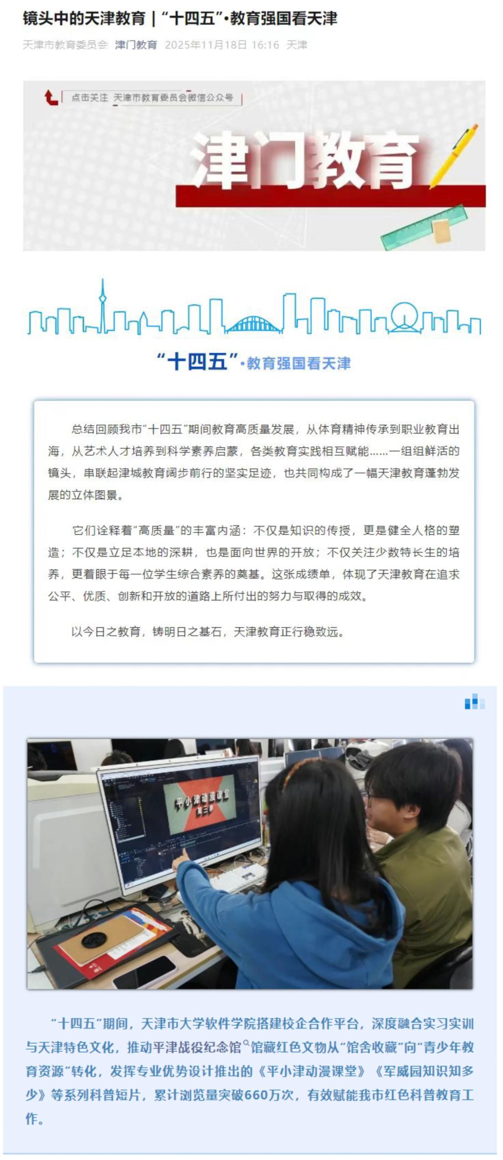 2025年11月18日,津门教育微信公众号以《镜头中的天津教育 | “十四五”·教育强国看天津》为题对我校进行了报道。