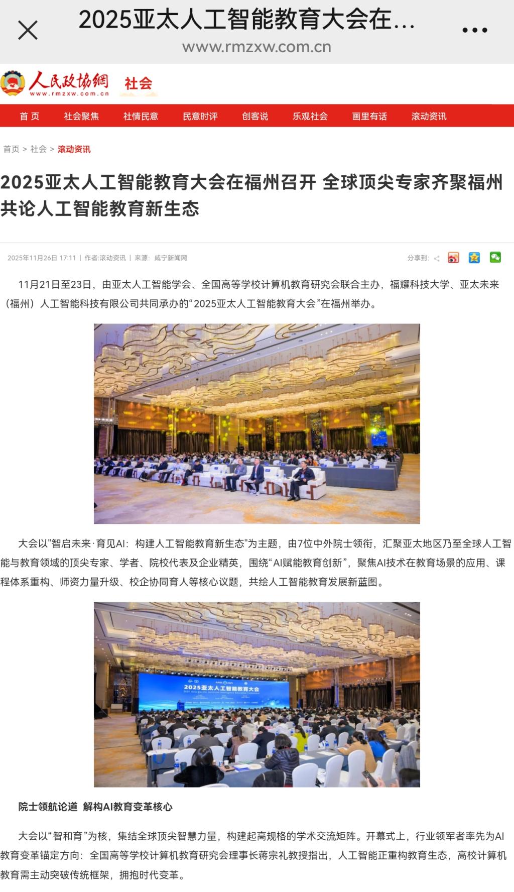2025年11月26日,人民政协网以《2025亚太人工智能教育大会在福州召开 全球顶尖专家齐聚福州 共论人工智能教育新生态》为题对我校进行了报道。