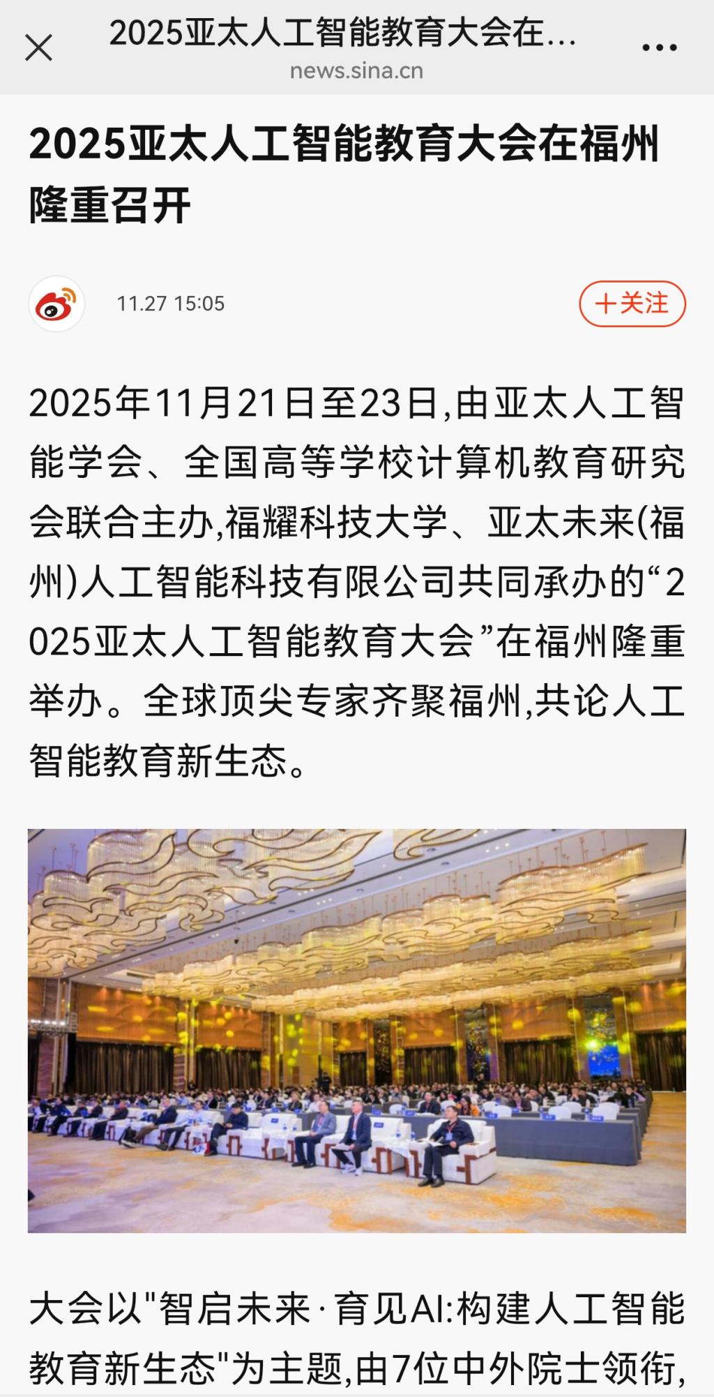 2025年11月27日,新浪新闻以《2025亚太人工智能教育大会在福州隆重召开》为题对我校进行了报道。