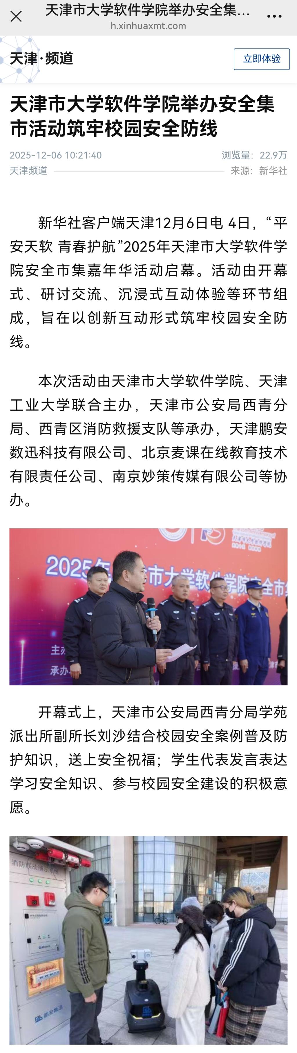 2025年12月6日,新华社客户端以《天津市大学软件学院举办安全集市活动筑牢校园安全防线》为题对我校进行了报道。