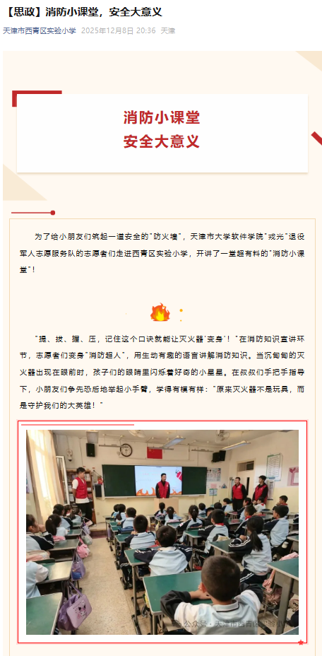 2025年12月8日,天津市西青区实验小学微信号以《消防小课堂,安全大意义》为题对我校进行了报道。