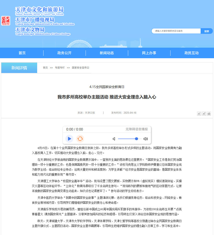 2025年4月16日,天津市文化和旅游局官网以《我市多所高校举办主题活动 推进大安全理念入脑入心》为题对我校进行了报道。