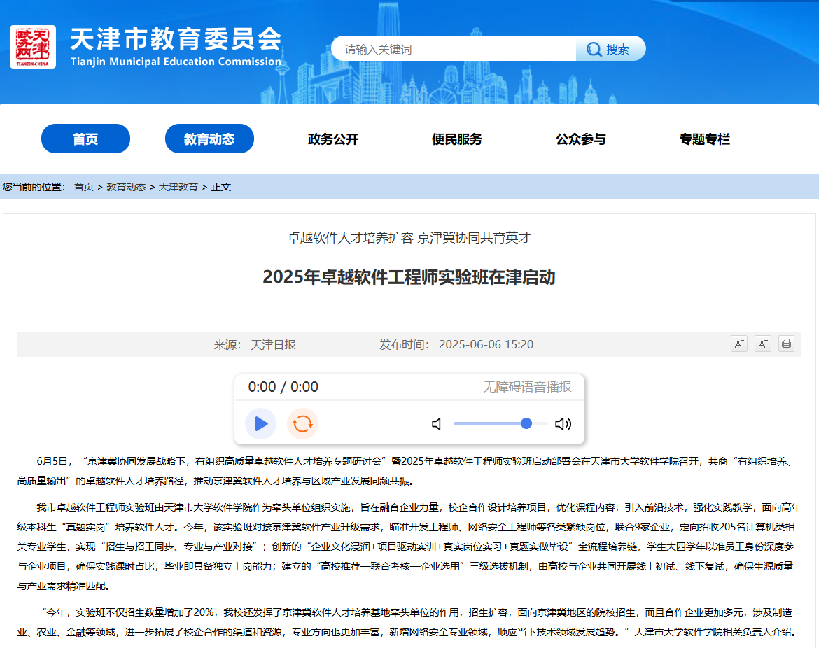 2025年6月6日,天津市教委官网以《2025年卓越软件工程师实验班在津启动》为题对我校进行了报道。