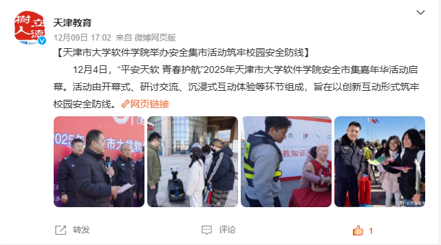 2025年12月9日,天津教育微博以《天津市大学软件学院举办安全集市活动筑牢校园安全防线》为题对我校进行了报道。