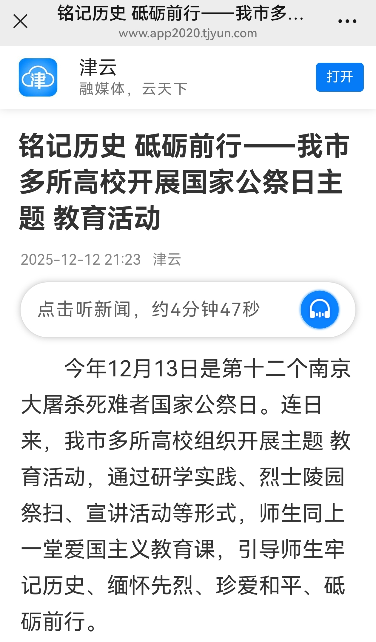 2025年12月12日,津云以《铭记历史 砥砺前行——我市多所高校开展国家公祭日主题 教育活动》为题对我校进行了报道。