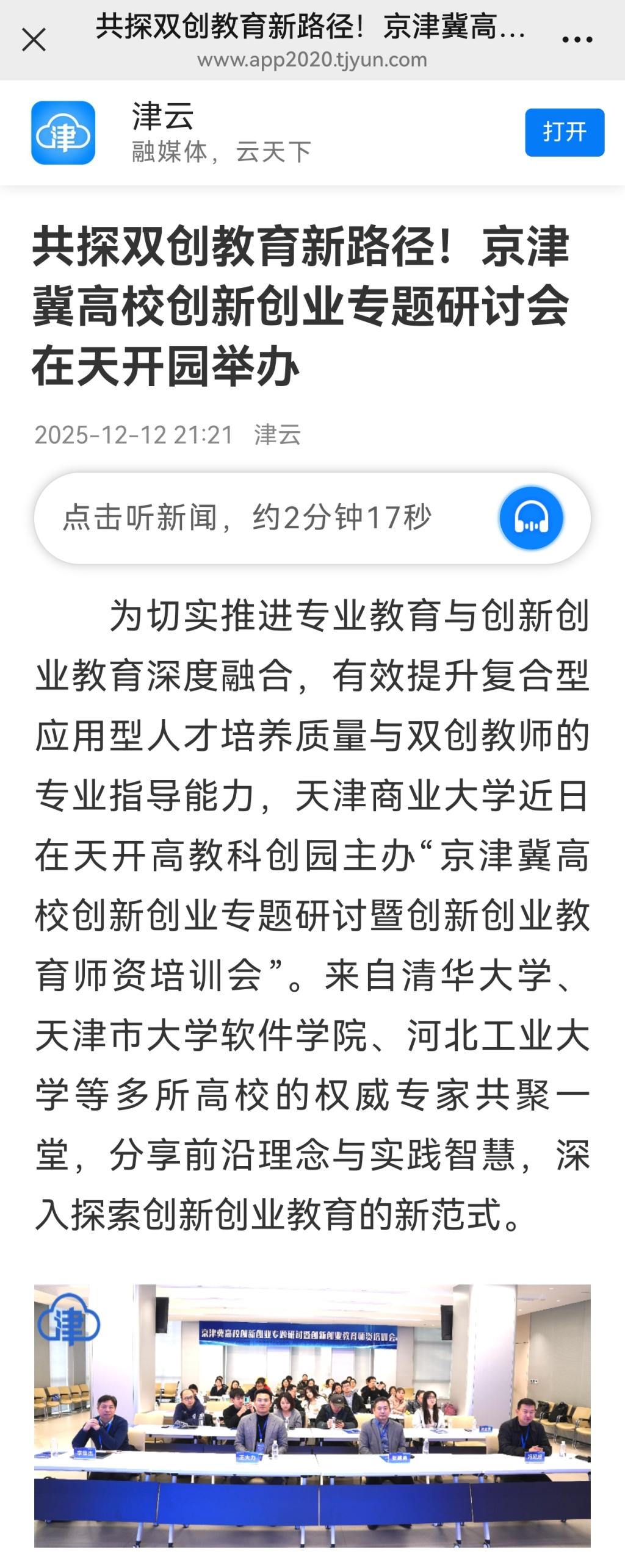 2025年12月12日,津云以《共探双创教育新路径!京津冀高校创新创业专题研讨会在天开园举办》为题对我校进行了报道。
