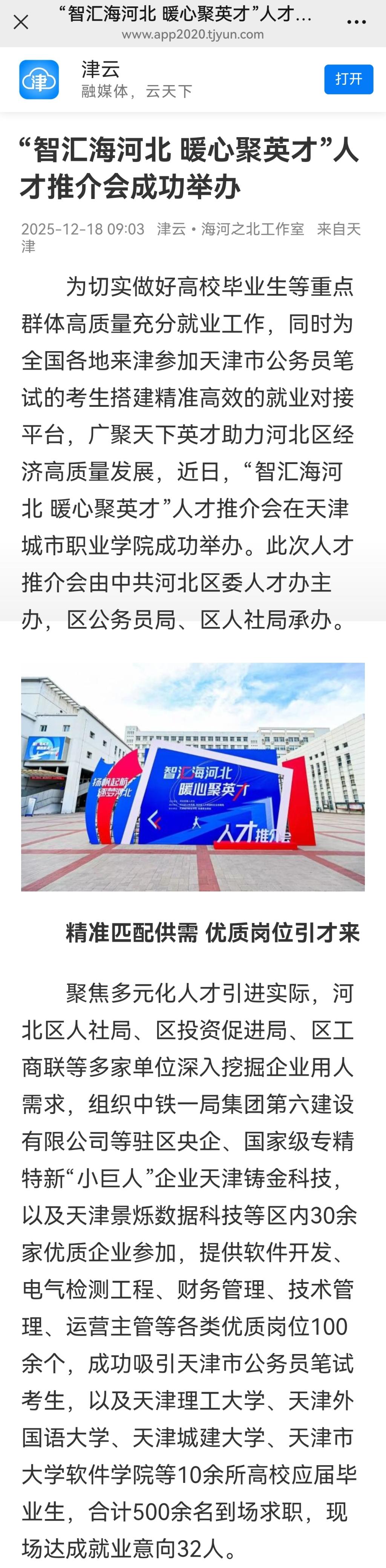 2025年12月18日,津云以《“智汇海河北 暖心聚英才”人才推介会成功举办》为题对我校进行了报道。
