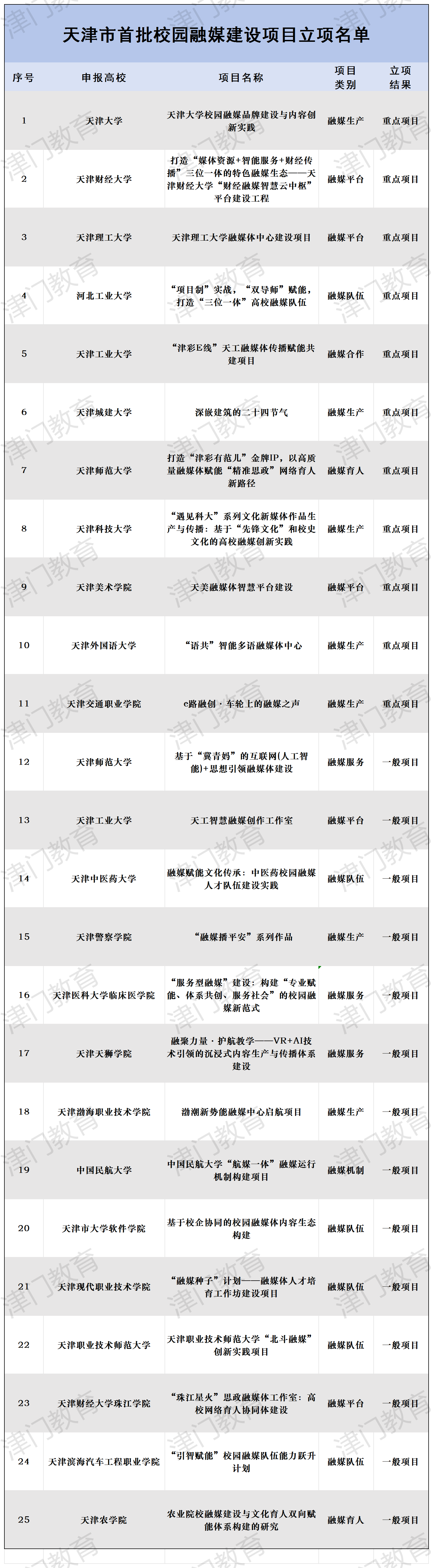 2025年12月26日,津门教育微信公众号以《我市首批校园融媒建设项目公布!》为题进行了报道。我校申报的《基于校企协同的校园融媒体内容生态构建》获一般项目立项。