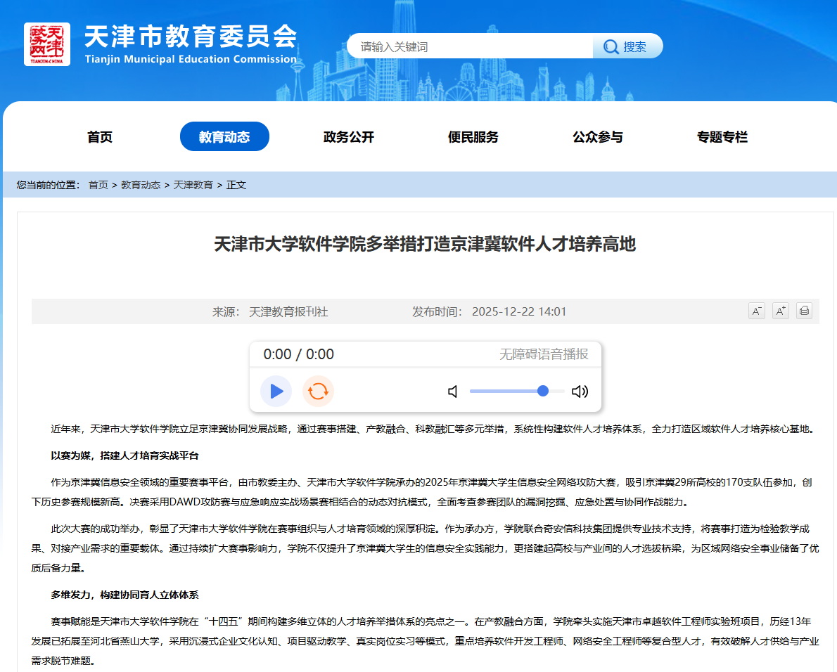 2025年12月22日,天津市教委官网以《天津市大学软件学院多举措打造京津冀软件人才培养高地》为题对我校进行了报道。