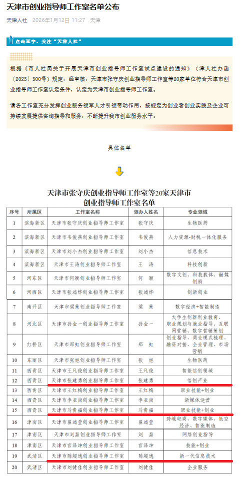2026年1月12日,“天津人社”微信公众号以《天津市创业指导师工作室名单公布》为题进行了报道。我校张建勇、陈超逸两位老师和协同育人企业逸漫科技的马贵福老师,其创业指导师工作室均符合天津市创业指导师工作室认定条件,认定为天津市创业指导师工作室。