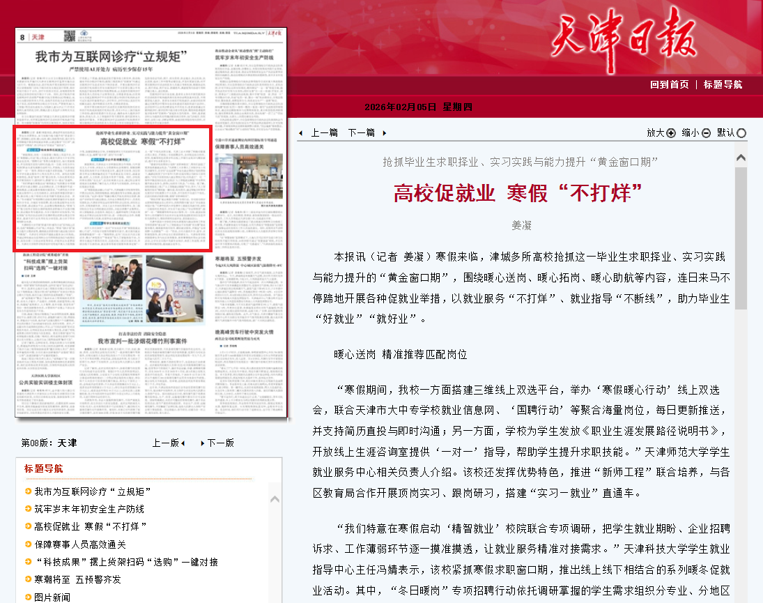 2026年2月5日,天津日报08版以《高校促就业 寒假“不打烊”》为题对我校进行了报道。