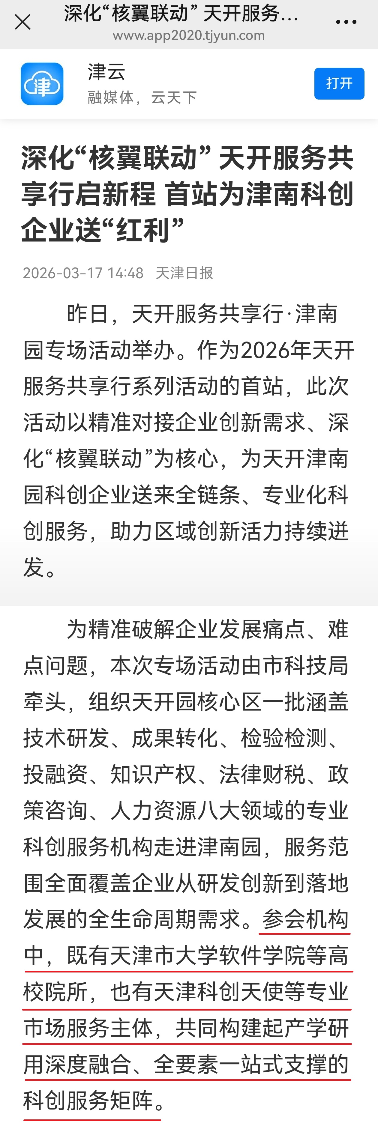 3月16日,“天开服务共享行·津南园专场”活动顺利举办。作为2026年天开服务共享行系列活动的首站,此次活动由市科技局牵头组织,汇聚了涵盖技术研发、成果转化、检验检测、投融资、知识产权、法律财税、政策咨询、人力资源等八大领域的优质科创服务机构,我校作为重要科创服务机构受邀参会,并开展专题宣讲。2026年3月17日,津云以《深化“核翼联动” 天开服务共享行启新程 首站为津南科创企业送“红利”》为题进行了报道。