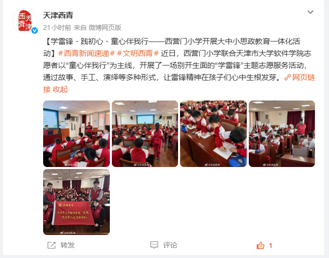 2026年3月26日,天津西青微博以《学雷锋・践初心・童心伴我行——西营门小学开展大中小思政教育一体化活动》为题对我校进行了报道。