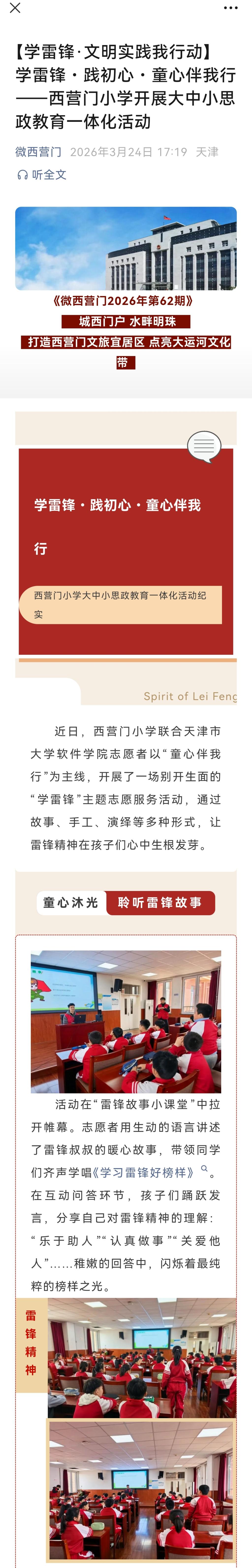 2026年3月24日,天津市西青区西营门街道办事处官方微信公众号“微西营门”以《学雷锋・践初心・童心伴我行——西营门小学开展大中小思政教育一体化活动》为题进行了报道。