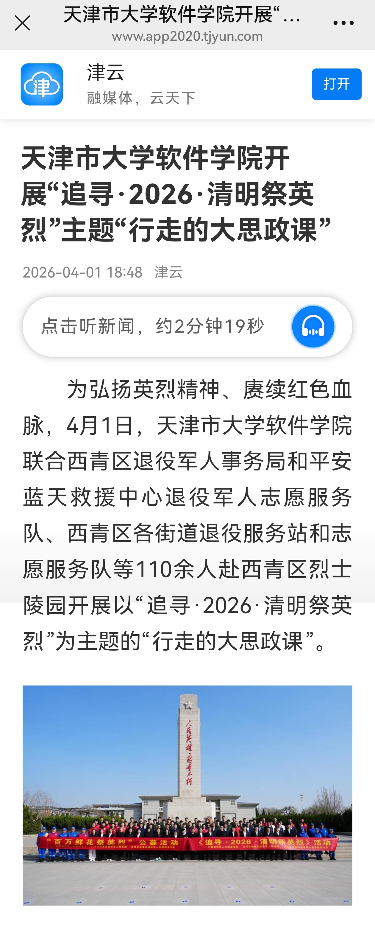 2026年4月1日,津云以《天津市大学软件学院开展“追寻·2026·清明祭英烈”主题“行走的大思政课”》为题对我校进行了报道。