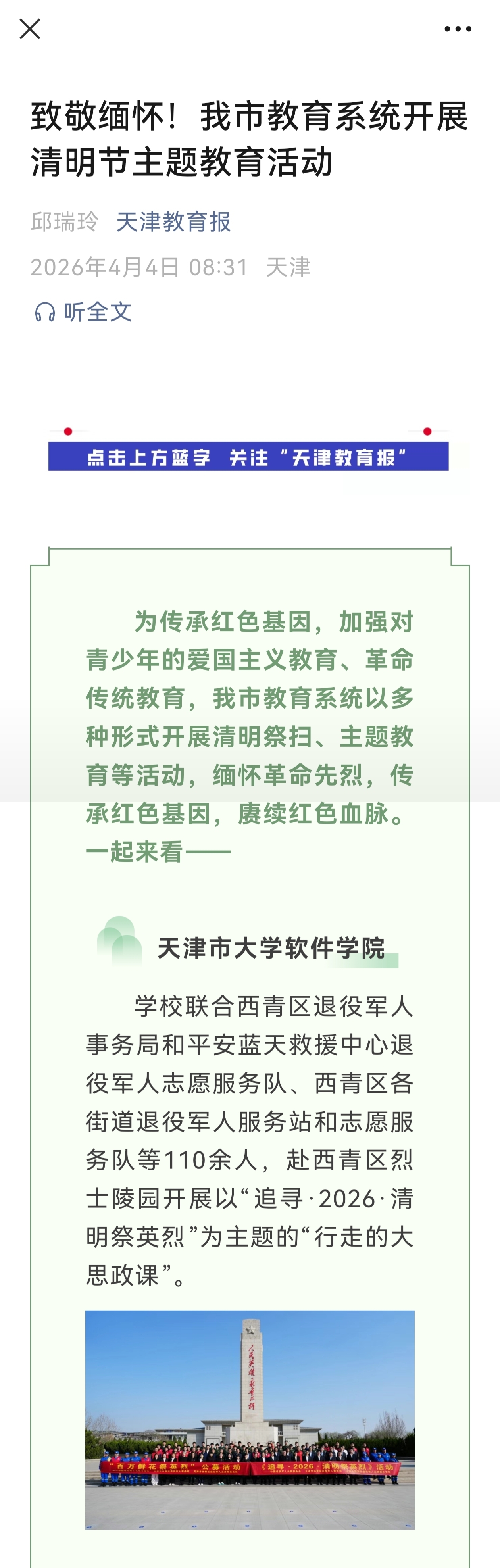 2026年4月4日,天津教育报微信公众号以《致敬缅怀!我市教育系统开展清明节主题教育活动》为题对我校进行了报道。