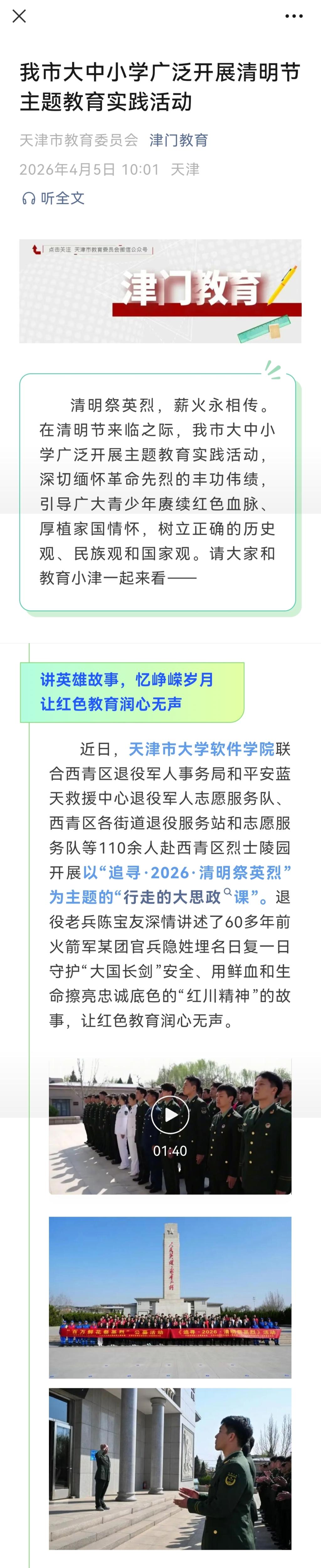 2026年4月5日,天津市教育委员会官方微信号“津门教育”以《我市大中小学广泛开展清明节主题教育实践活动》为题对我校进行了报道。
