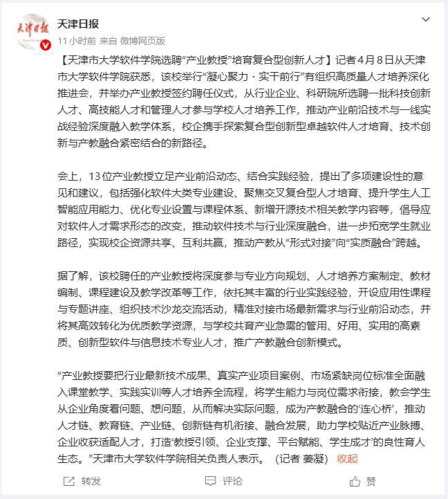 2026年4月8日,天津日报微博以《天津市大学软件学院选聘“产业教授”培育复合型创新人才》为题对我校进行了报道。