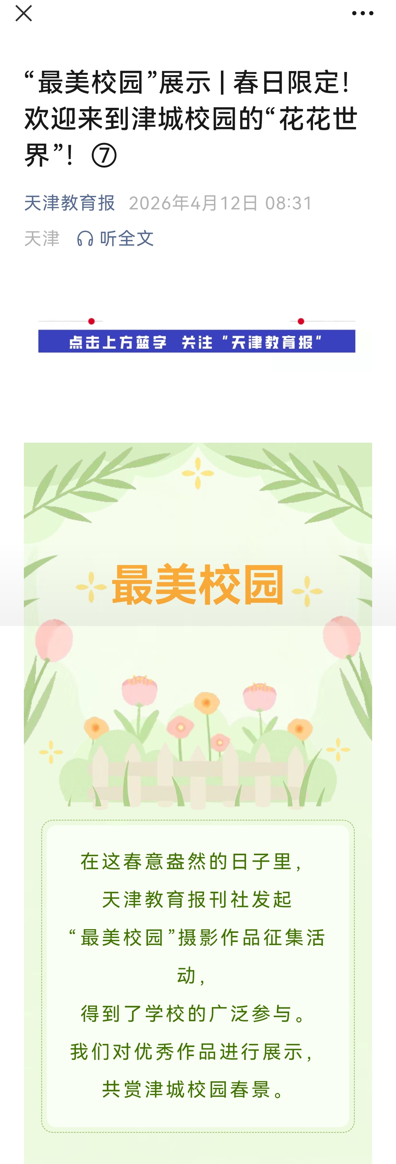 2026年4月12日,天津教育报微信公众号以《“最美校园”展示 | 春日限定!欢迎来到津城校园的“花花世界”!⑦》为题对我校进行了报道。