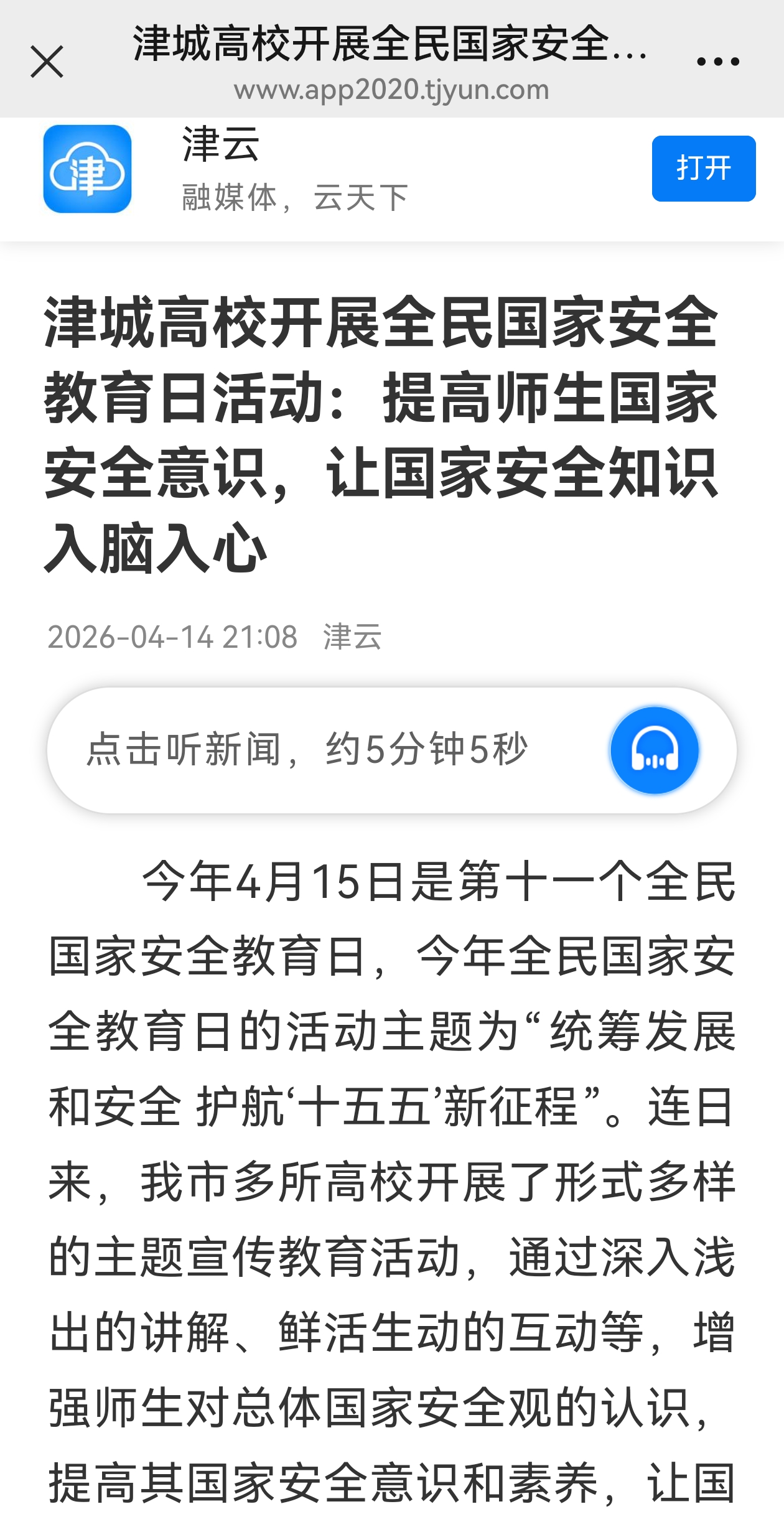 2026年4月14日,津云以《津城高校开展全民国家安全教育日活动:提高师生国家安全意识,让国家安全知识入脑入心》为题对我校进行了报道。