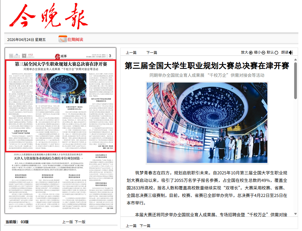 2026年4月24日,今晚报03版以《第三届全国大学生职业规划大赛总决赛在津开赛 同期举办全国就业育人成果展 “千校万企”供需对接会等活动》为题对我校进行了图片新闻报道。