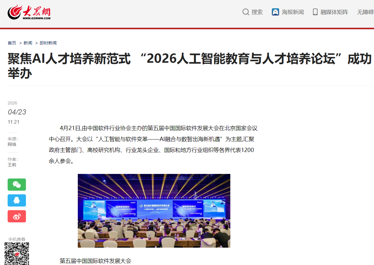 2026年4月23日,中共山东省委宣传部主管的、大众报业集团主办的山东省重点新闻网站和外宣网站“大众网”以《聚焦AI人才培养新范式 “2026人工智能教育与人才培养论坛”成功举办》为题对我校进行了报道。
