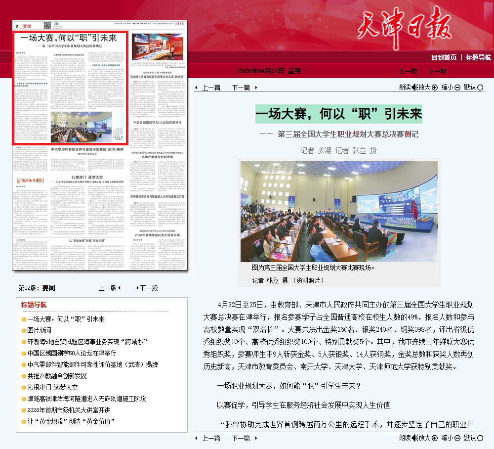 4月22日,第三届全国大学生职业规划大赛全国总决赛在天津正式启幕。本次大赛由教育部与天津市人民政府共同主办,天津市教育委员会、南开大学、天津大学、天津师范大学联合承办,以“筑梦青春志在四方,规划启航职引未来”为主题,为期4天的赛事将汇聚全国顶尖学子,搭建起职业规划交流、人才供需对接的高端平台,助力大学生高质量就业与成长成才。除主体赛事外,总决赛期间我校承办天开园大学生创新创业成果展,作为赛事的重要同期活动之一。2026年4月27日,天津日报02版以《一场大赛,何以“职”引未来》为题进行了报道。