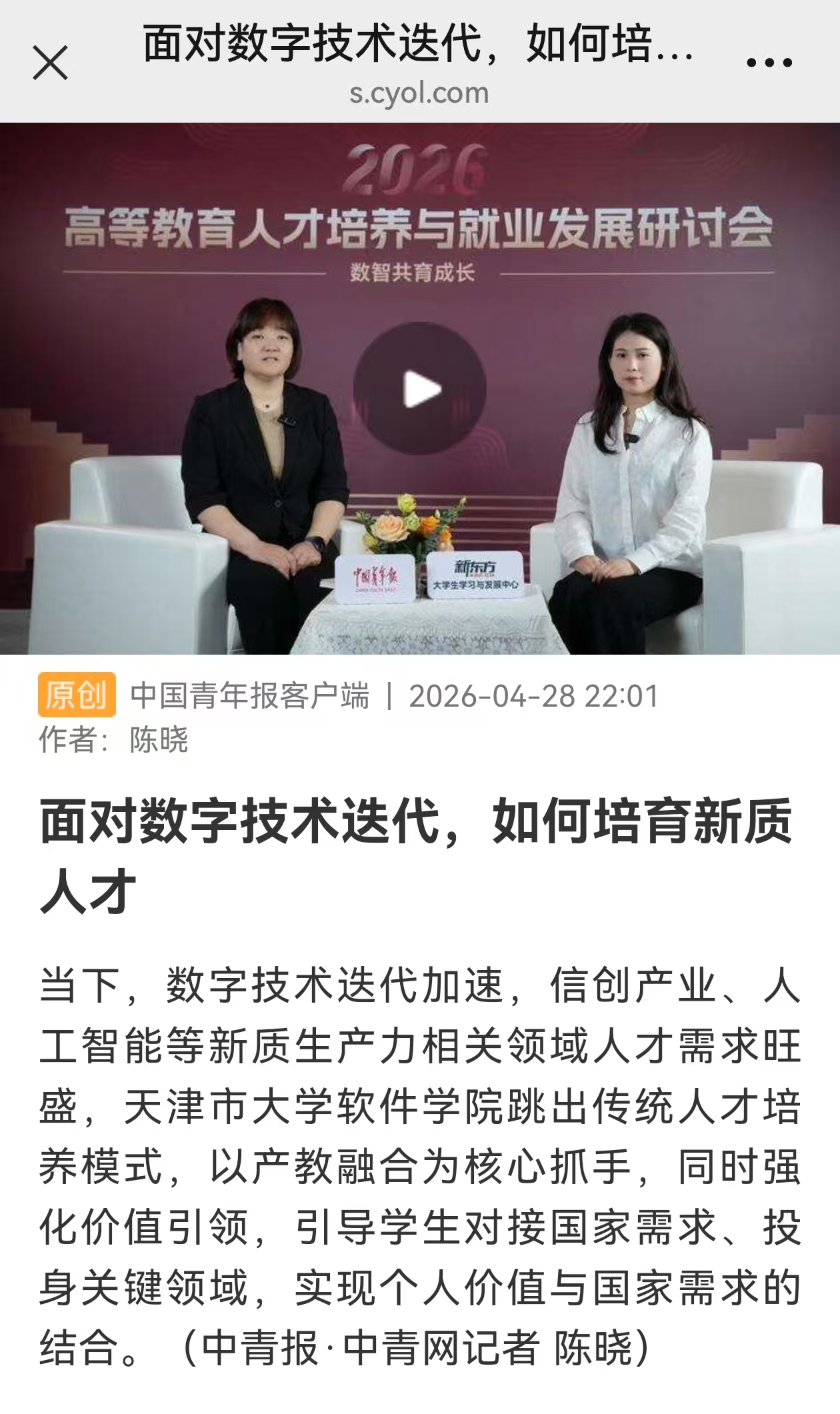 2026年4月28日,中国青年报客户端以《面对数字技术迭代,如何培育新质人才》为题对我校进行了报道。