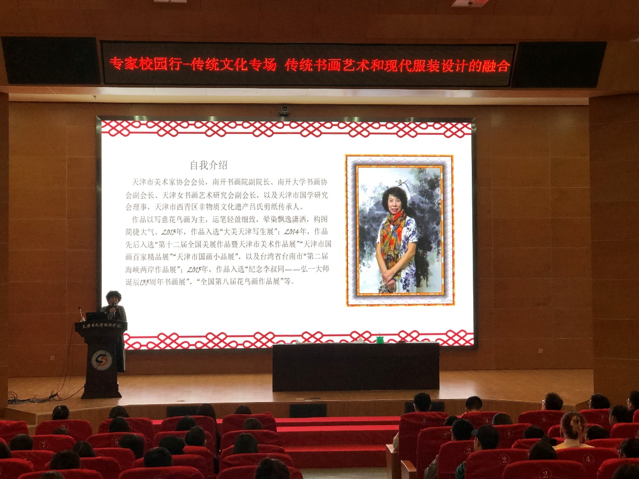 2019年11月7日,专家校园行系列讲座在D区报告厅开展了2019-2020学年第四场,特别邀请到南开书画院副院长吕爱茹老师为大家带来“传统书画艺术和现代服装设计的融合”为主题的精彩讲座。