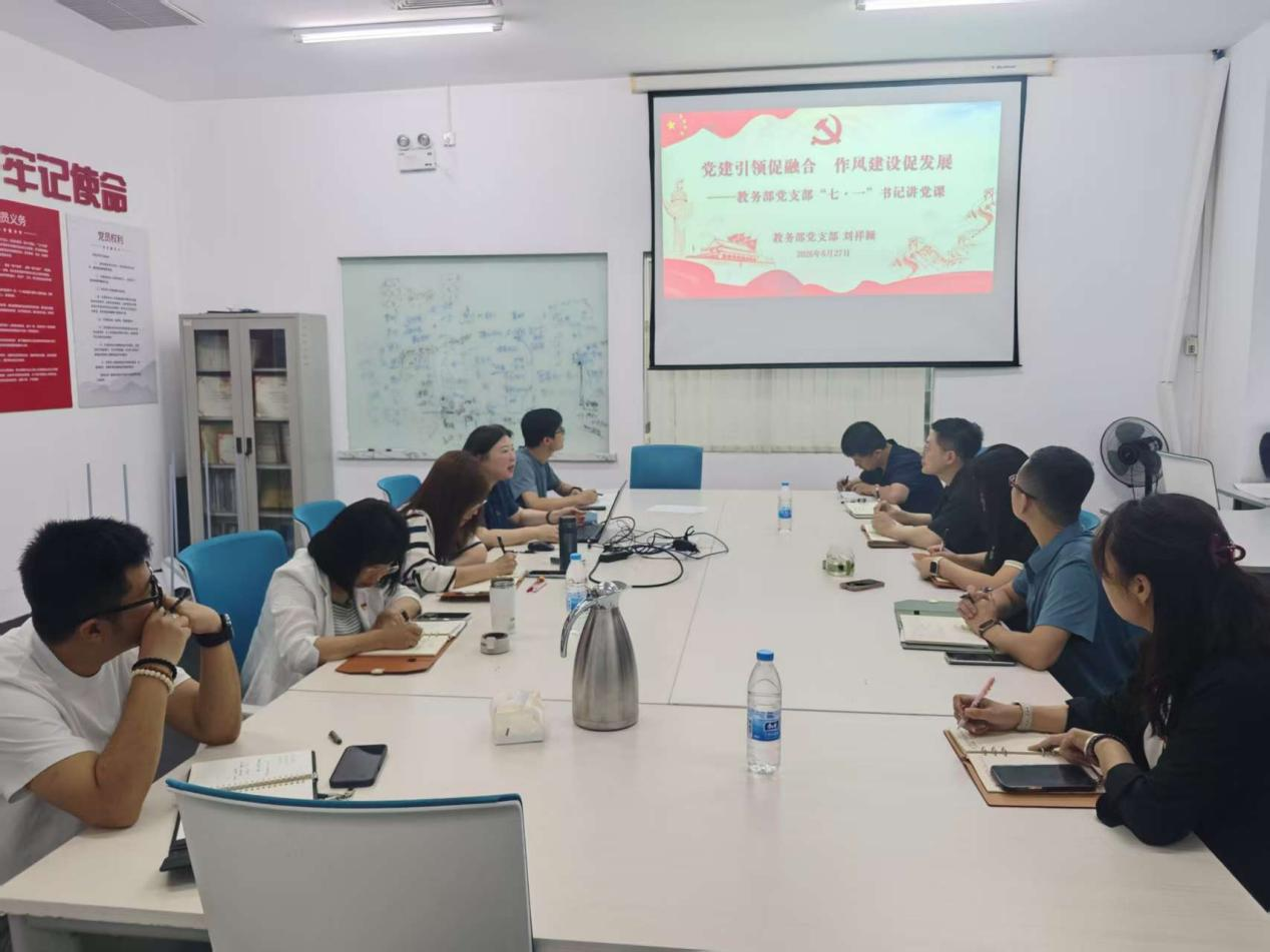 2025年6月27日,教务部党支部以“党建引领促融合,作风建设促发展”为主题开展支部书记讲党课活动。党支部书记刘祥颖结合中央八项规定精神学习与学院发展实际,围绕党建业务融合、作风建设、产教融合等核心内容,为支部党员及积极分子带来兼具理论高度与实践深度的专题授课。