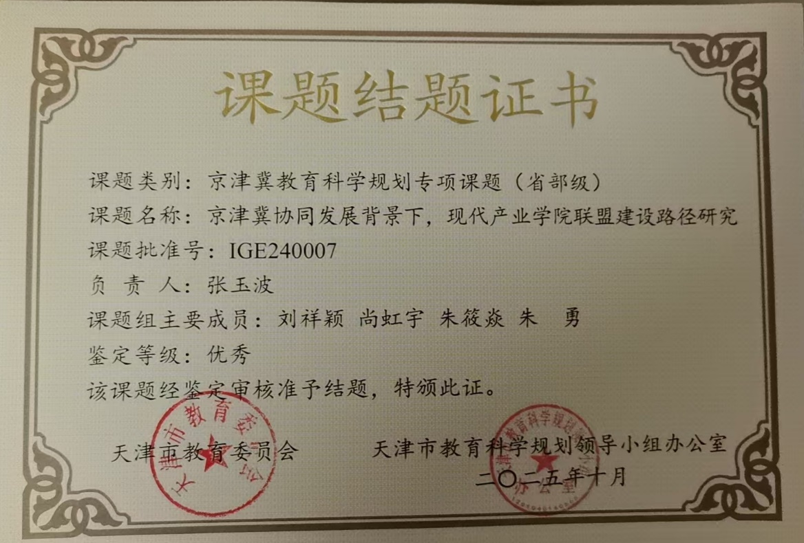 近日,由天津市教育委员会组织的京津冀教育科学规划专项课题结项评审结果正式发布。我校申报的课题《京津冀协同发展背景下,现代产业学院联盟建设路径研究》(课题批准号:IGE240007)顺利通过结项验收,并获评“优秀”,标志着我校在京津冀教育协同发展领域取得重要突破。