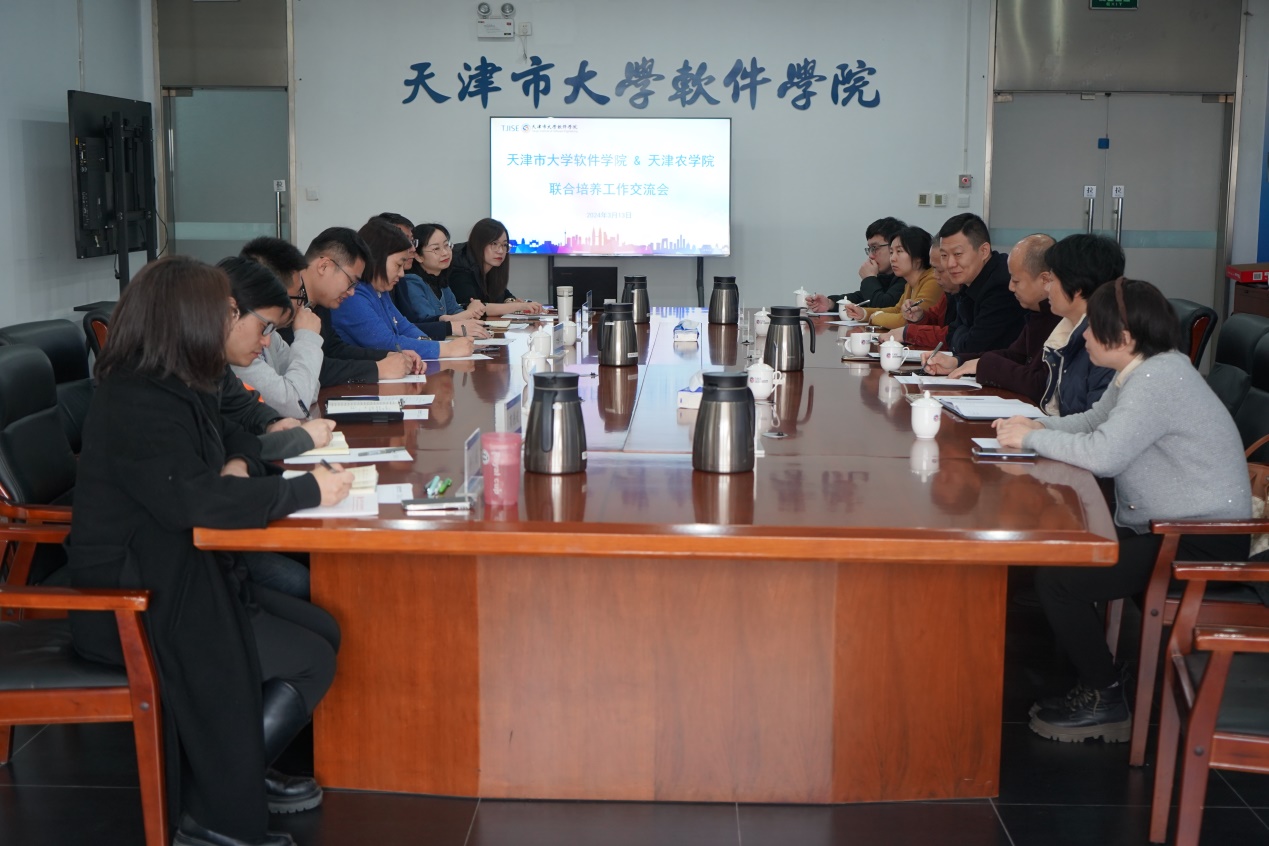 为进一步推动产学研深度融合,加强校际合作与交流,天津市大学软件学院与天津农学院于2024年3月13日上午举行了联合培养工作交流会。农学院计算机与信息工程学院党委书记田勇、副院长王育欣、天津市大学软件学院副校长刘军利、学生工作部冯增振部长及沈士强副部长出席会议。