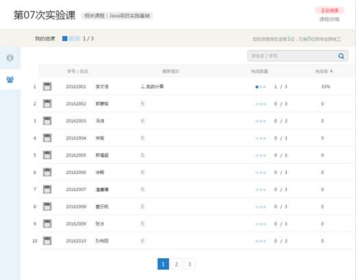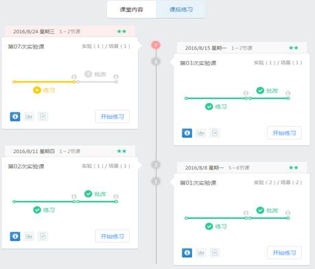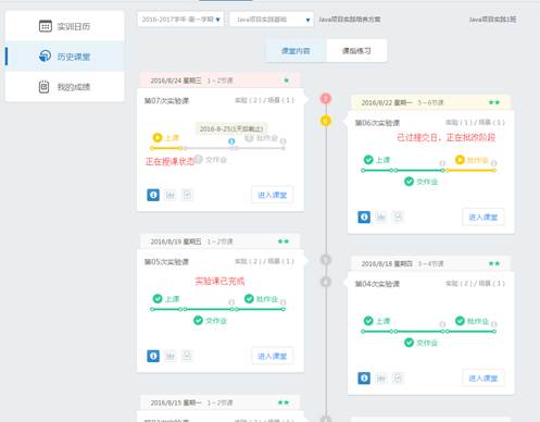 1. 已经开始的实验课会在历史课堂中,由下往上依次排列显示,实验课的进度条,会由实验课的状态进行颜色变化,进度条上会显示每节实验课的提交截止日期以及批改截止日期,