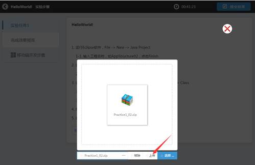 4.1 点击一个实验案例/场景,进入实验步骤界面,右上角提交,选择40M以内.zip格式文件,上传,上传后的文件可以下载,如图2-8,上传成功后回到实验课界面