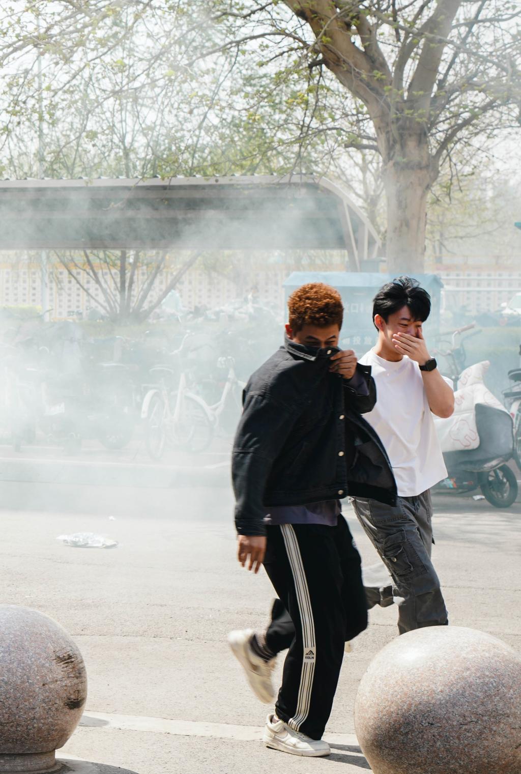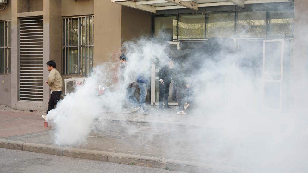 中午12:40时,校园内警报声响起。学生公寓5号楼出现火情,浓烟四起,5号楼各楼层安全员迅速就位,组织学生用湿毛巾捂住口鼻,弯腰低姿态,沿安全通道迅速撤离。各楼层、各楼梯口均安排专人负责引导,确保疏散通道畅通无阻;在疏散过程中不断提醒学生注意安全,避免拥挤和踩踏事故发生。整个疏散过程紧张有序,达到了预期演练效果。