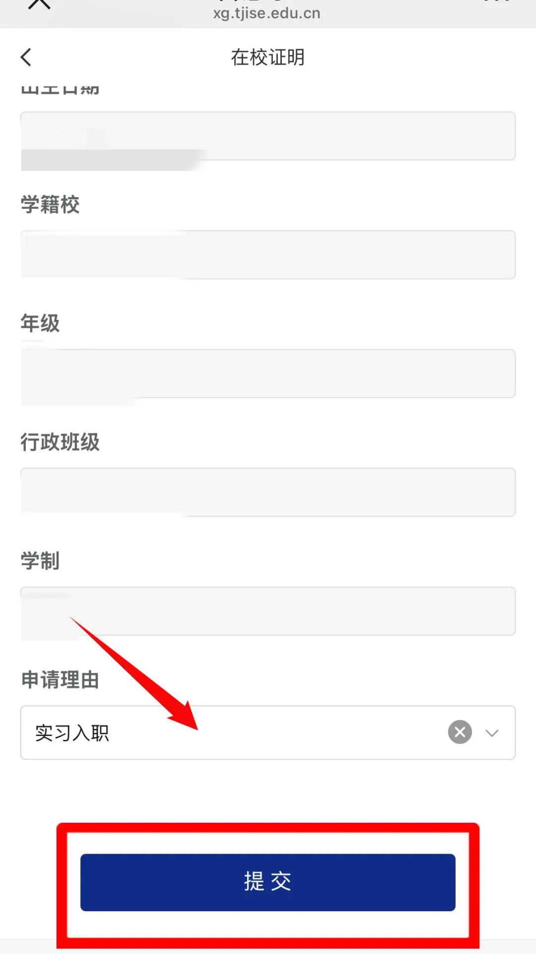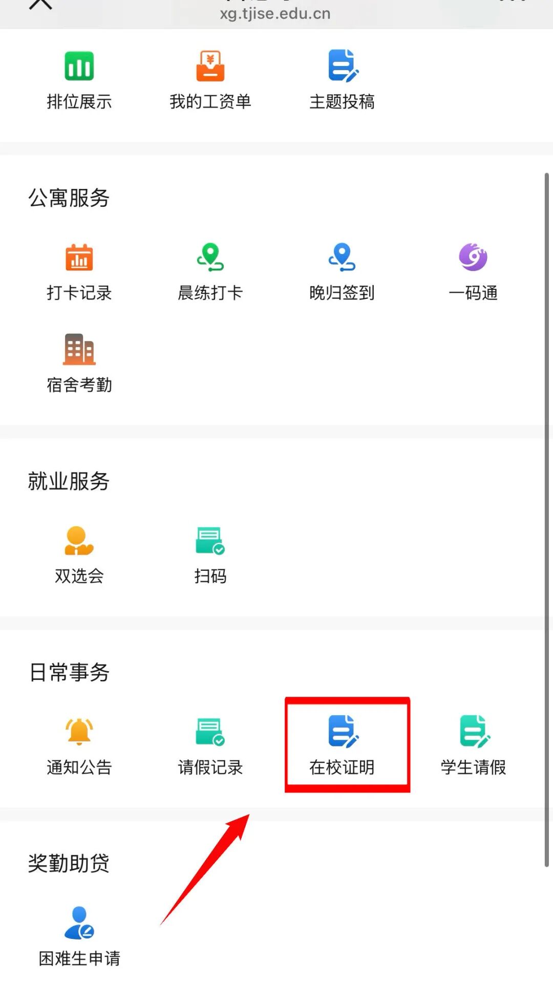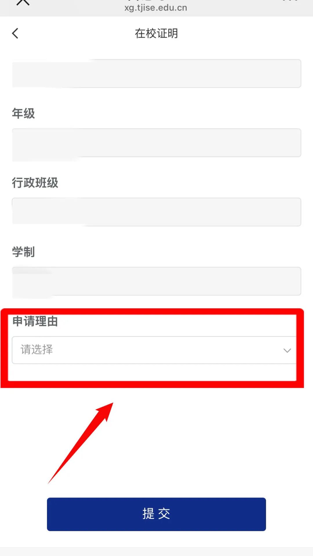 点击日常事务模块:【在校证明】,进入在校证明信息填写页面,个人信息会自动带出无需填写(若个人信息有误,请联系辅导员老师进行修改),下滑到底部,选择【申请理由】后,点击【提交】按钮,即可发起在校证明申请。