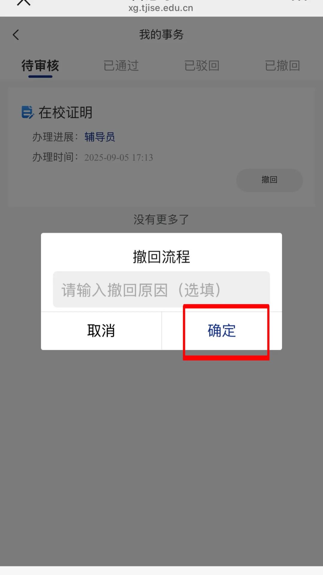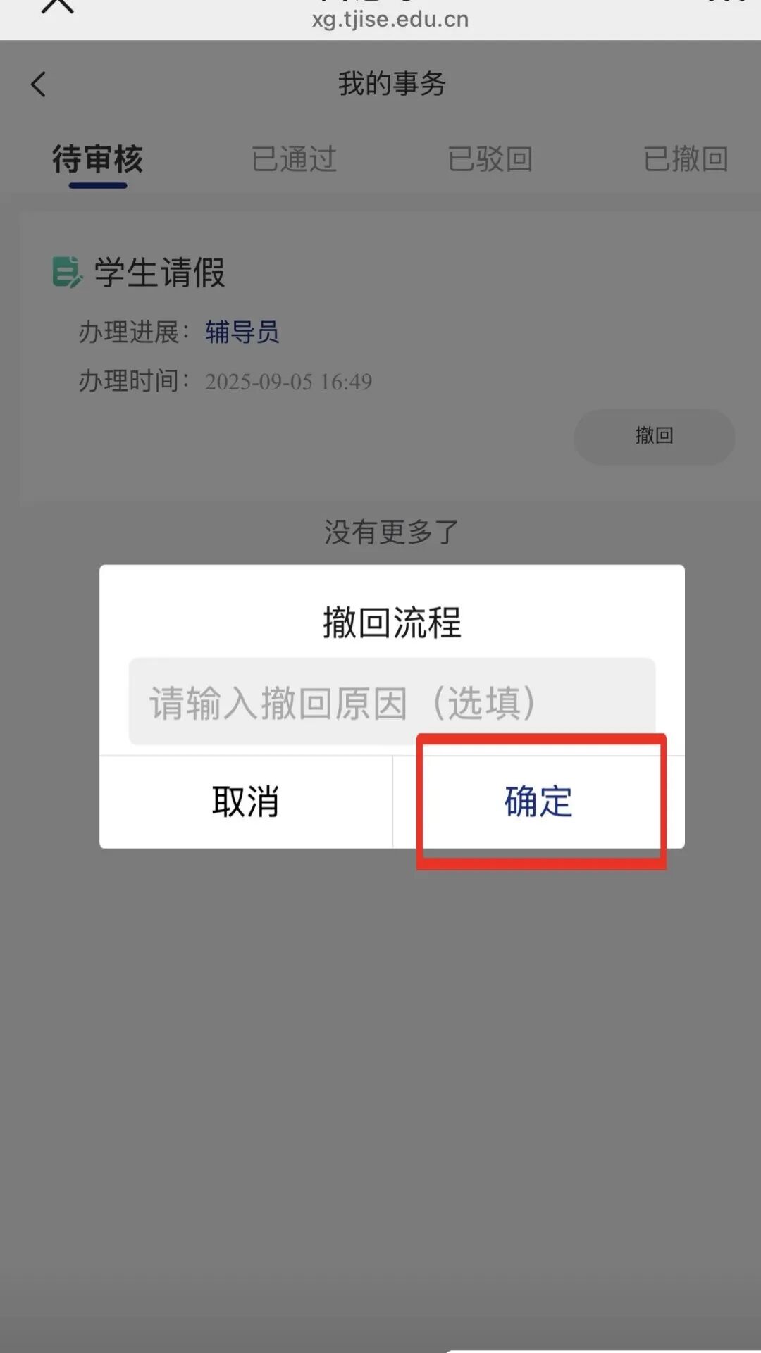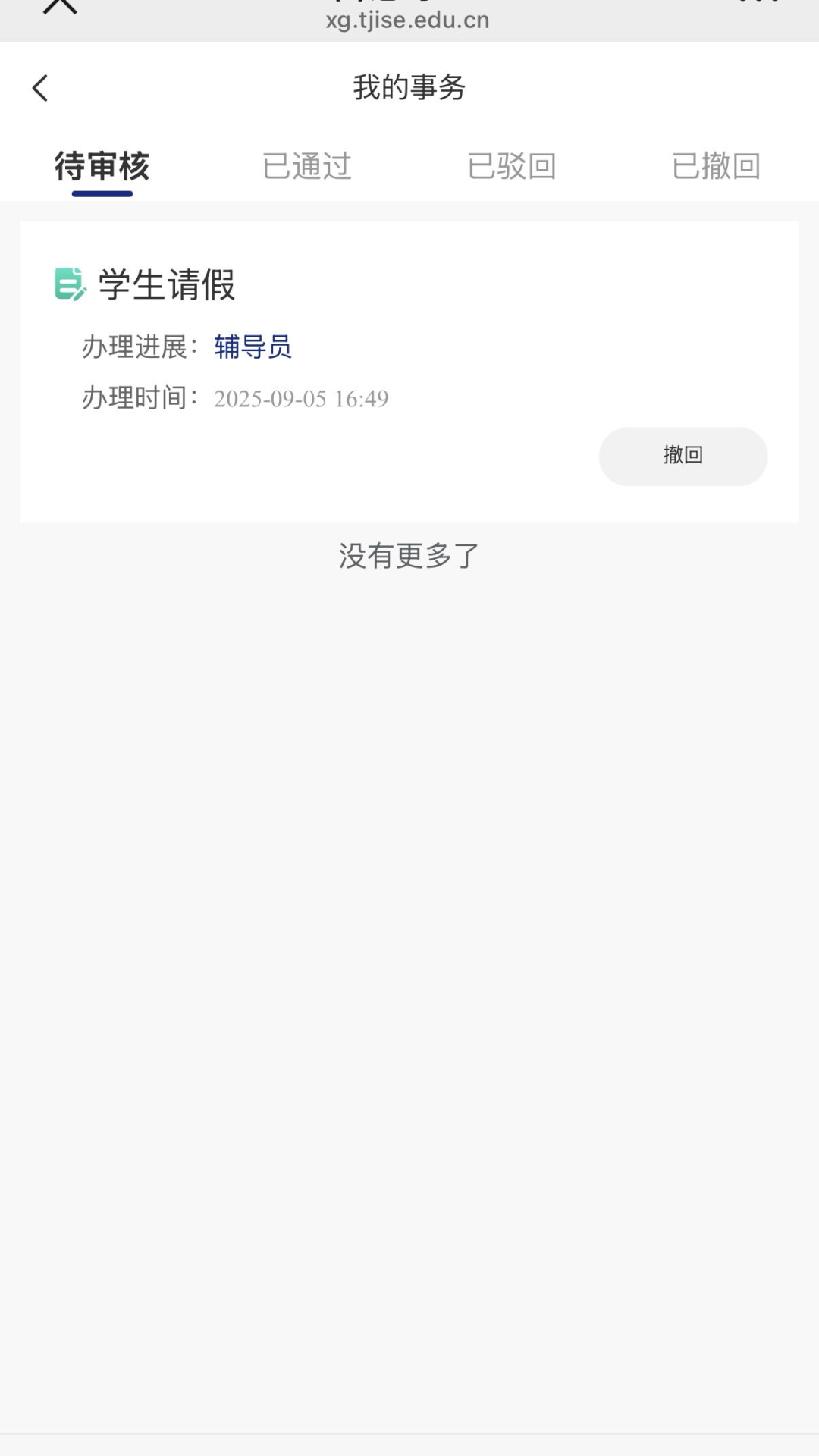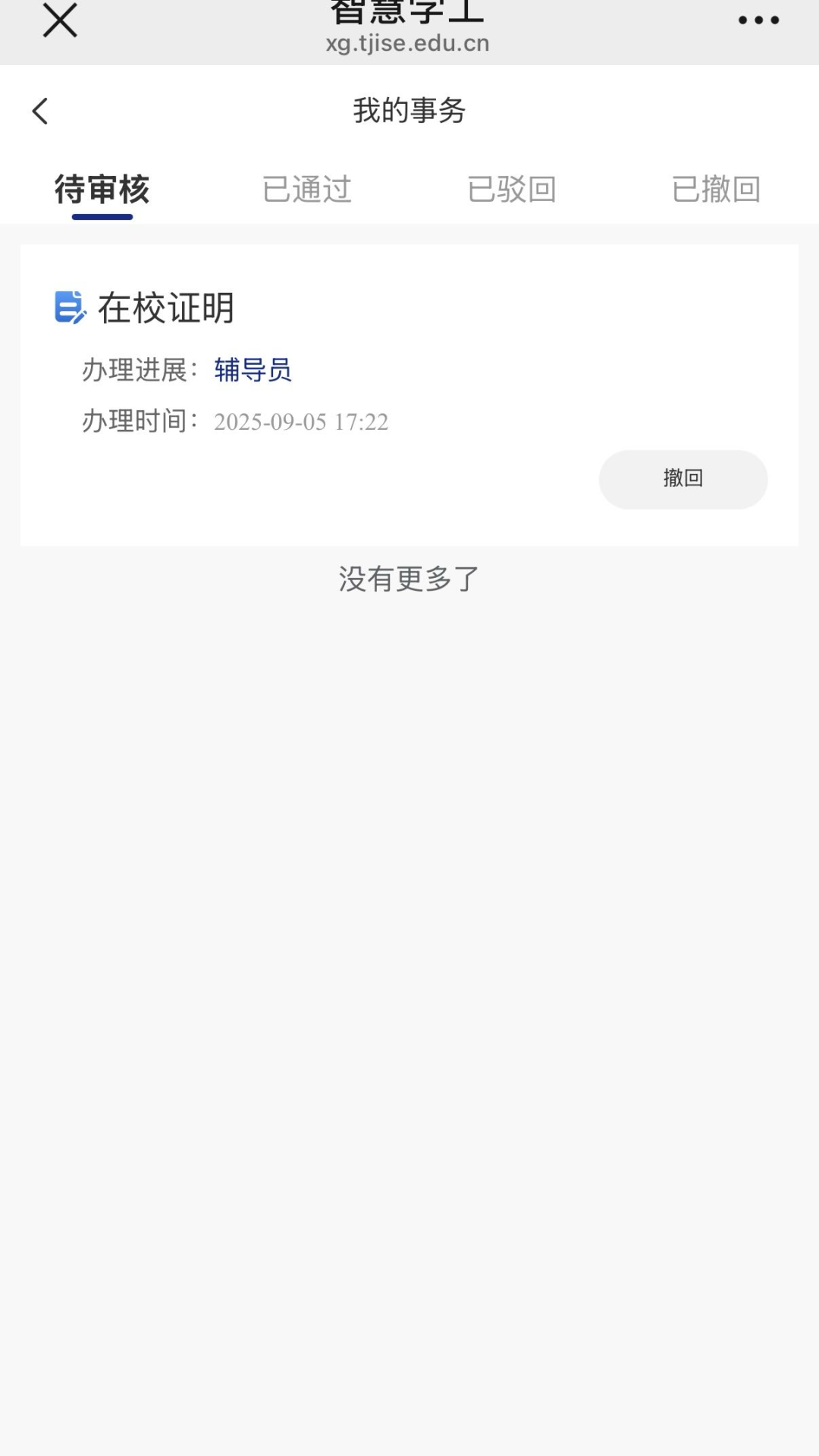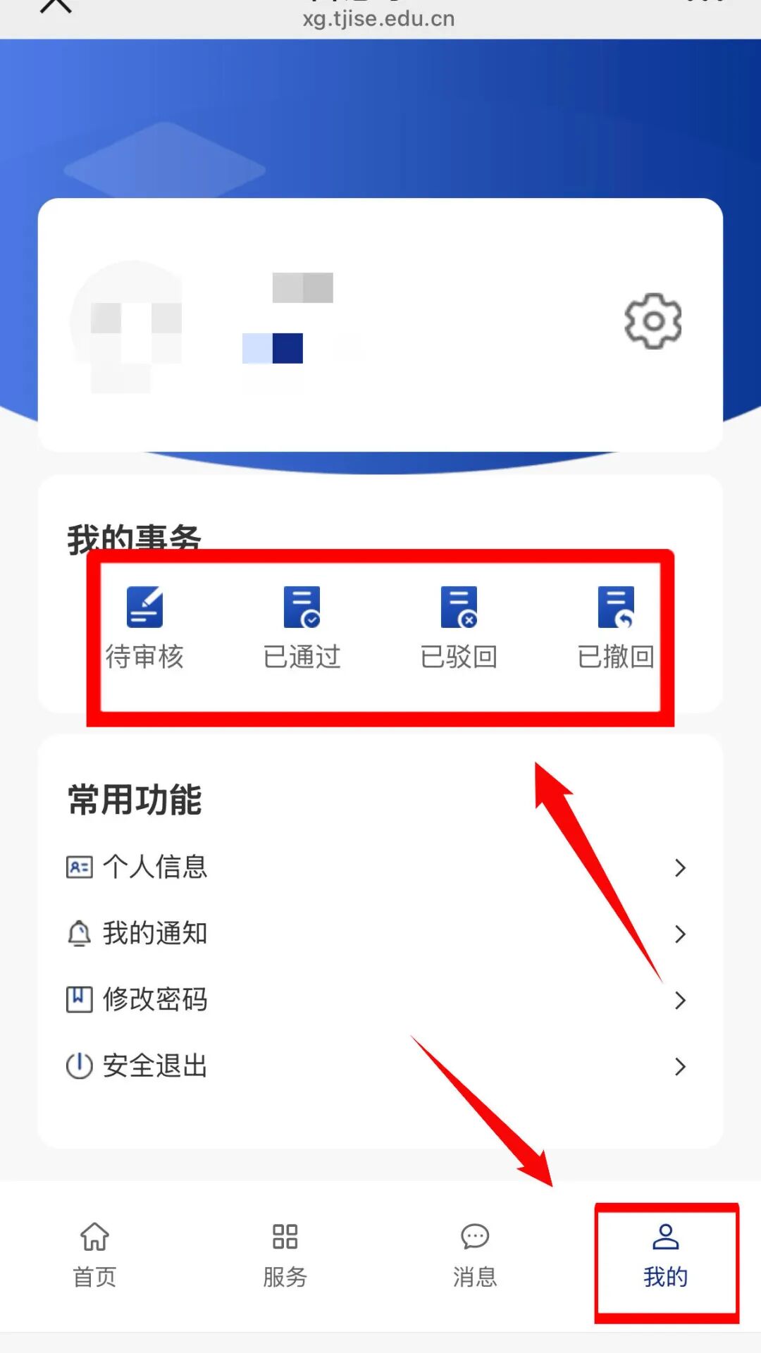 提交成功后,可点击下方【我的】切换到个人信息页,点击【我的事务】,可查看审批情况。若填写有误,可点击【撤回】按钮撤回申请,重新填写。