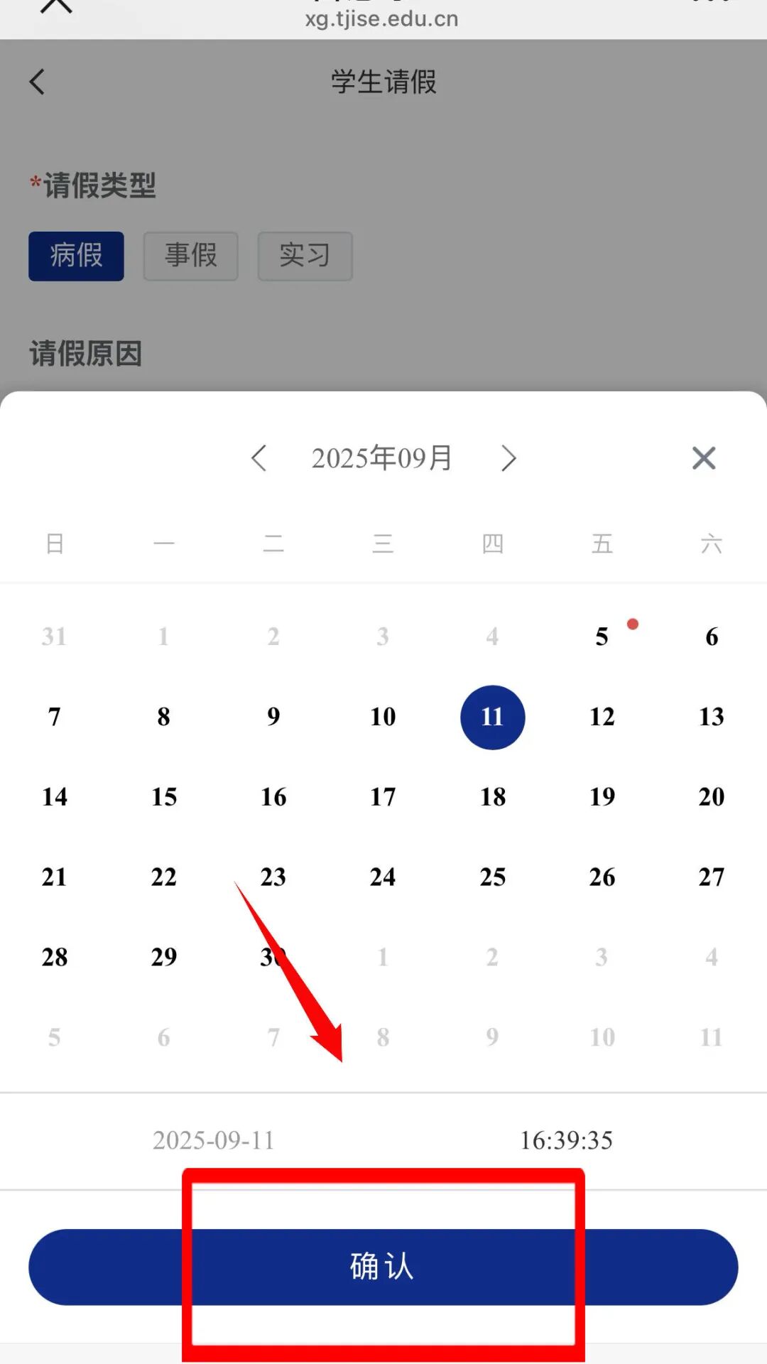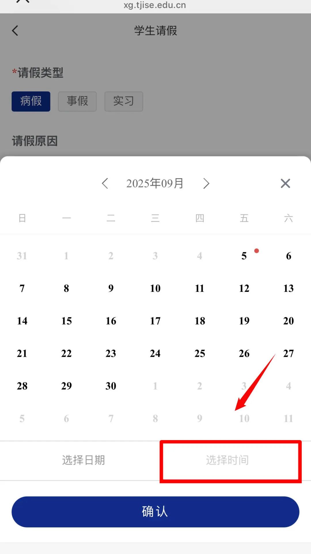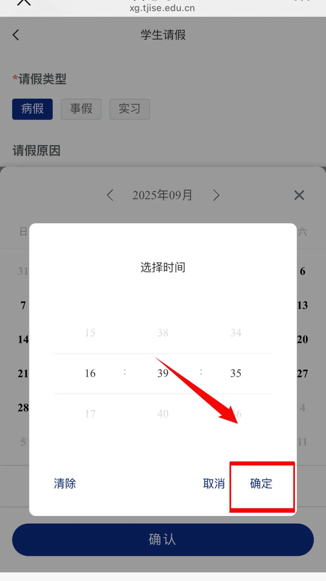 注意:请假时间选择精确到时、分、秒,,点击选择具体时间后,再点击【确定】按钮即可成功选择。