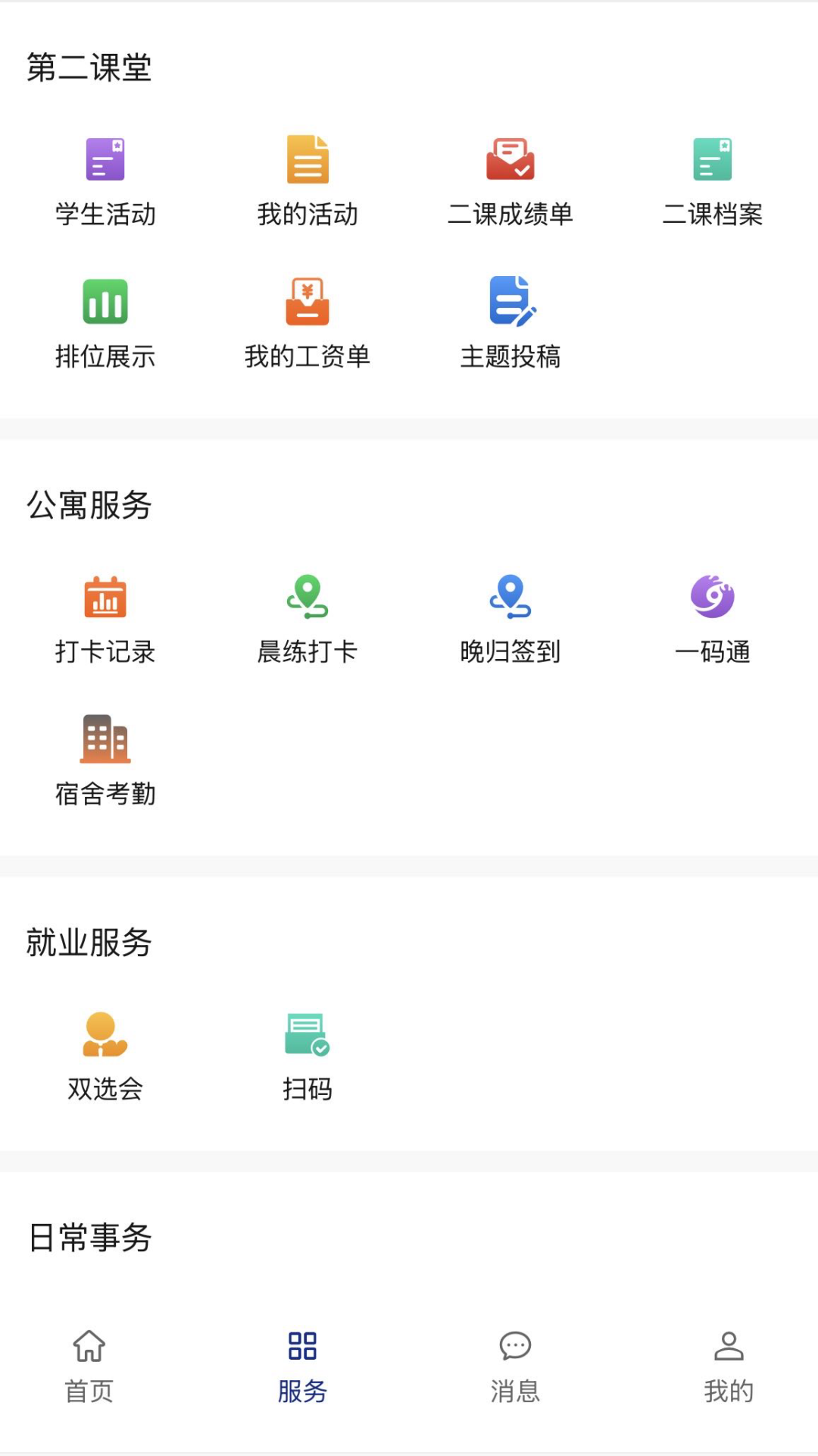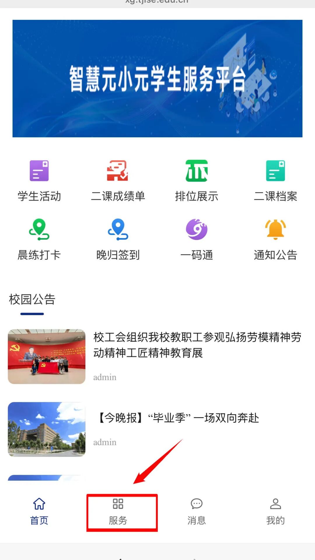 登录后从首页点击下方【服务】按钮,进入服务页面。