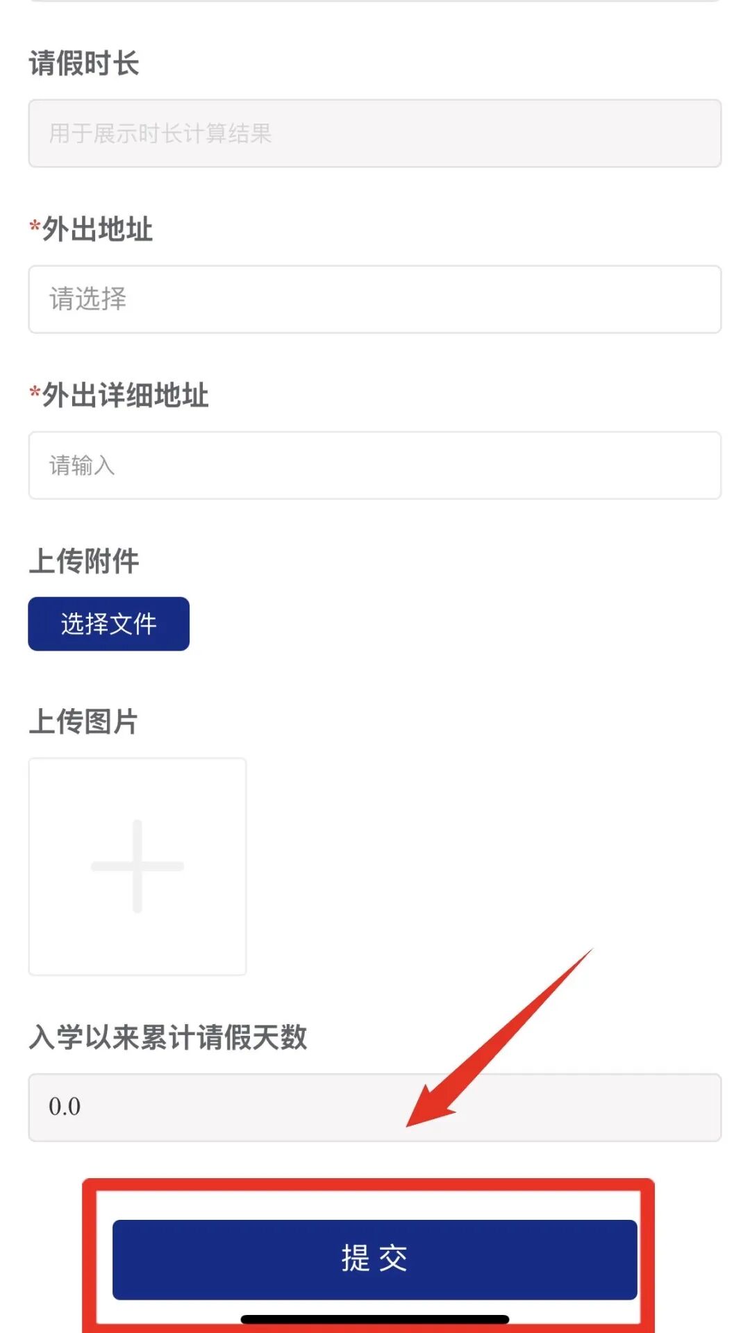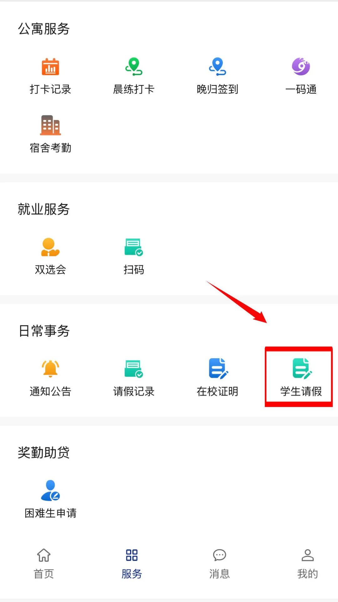 点击日常事务模块:【学生请假】,进入学生请假申请页面,填写各项信息后,点击【提交】按钮,即可发起申请。