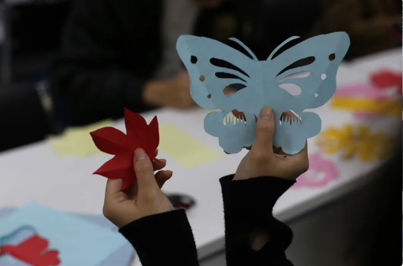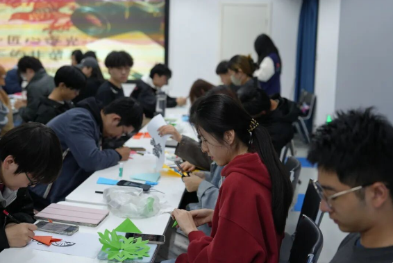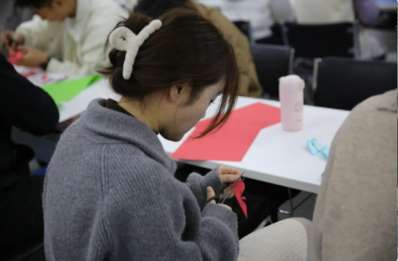 无论是初次尝试的新手,还是有一定基础的剪纸爱好者,都在活动中找到了属于自己的乐趣。同学们在剪纸的过程中放下忙碌,沉浸在慢时光里,感受传统技艺带来的宁静与治愈。大家相互交流技巧,分享创作心得,现场洋溢着欢声笑语,红纸翻飞间,不仅是技艺的传递,更是文化的共鸣。