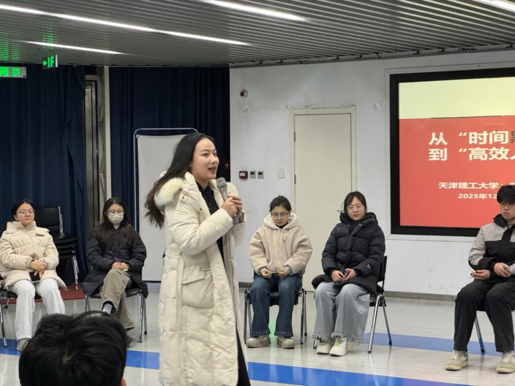 2025年12月4日,学院心灵环游社在天软云端开展了一场“从‘时间黑洞’到‘高效人生’”心理团体辅导活动。此次活动邀请到了天津理工大学的刘芝塞老师,在刘老师的引导下,报名学生通过趣味互动与工具实操,开启了一场关于时间认知的觉醒之旅。