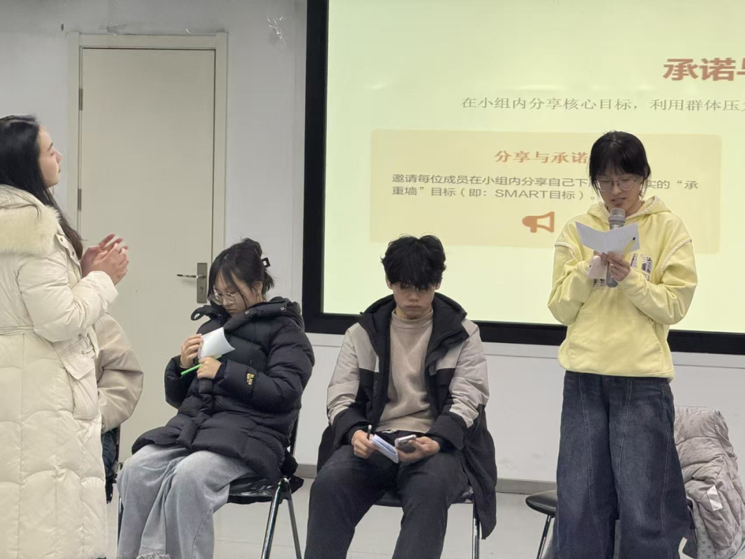 活动尾声的“收获圈”将氛围推向高潮。同学们在小组内公开承诺下周核心目标,并通过“收获圈”分享今日最大感悟与具体行动计划。一句句“学会先放承重墙”“SMART让目标更清晰”的真诚发言,凝聚成共同成长的动力。