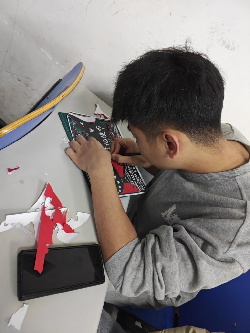 “这一刀要刻得稳,就像我们各民族紧紧团结在一起;这图案要画得正,就像我们对祖国的心意始终赤诚。”在卓越第七分公司组织的“纸载千年、刻绘山河”非遗刻纸活动现场,一名少数民族同学手持刻刀,在红色宣纸上精心雕琢着“民族团结一家亲”的图案,刀尖流转间,纸屑纷飞如蝶,一幅融合民族特色纹样与五星元素的作品渐显雏形。同学们以纸为媒、以刀为笔,在传承非遗技艺的同时,抒发着对祖国山河的热爱与对民族团结的礼赞。