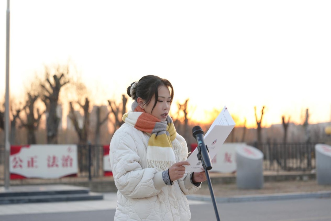 上午7时30分,升旗仪式正式开始。国旗护卫队步伐铿锵,护送五星红旗庄严入场。全体师生肃立,高唱中华人民共和国国歌,注视着鲜艳的国旗冉冉升起,飘扬在晨曦之中。