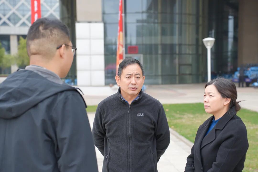 △媒体记者(左二)与学工部负责人(右一)交流招聘会整体情况