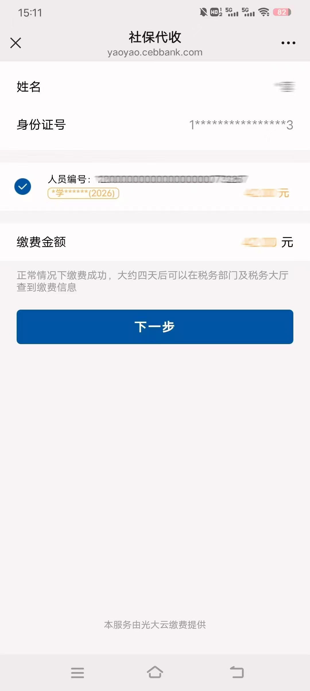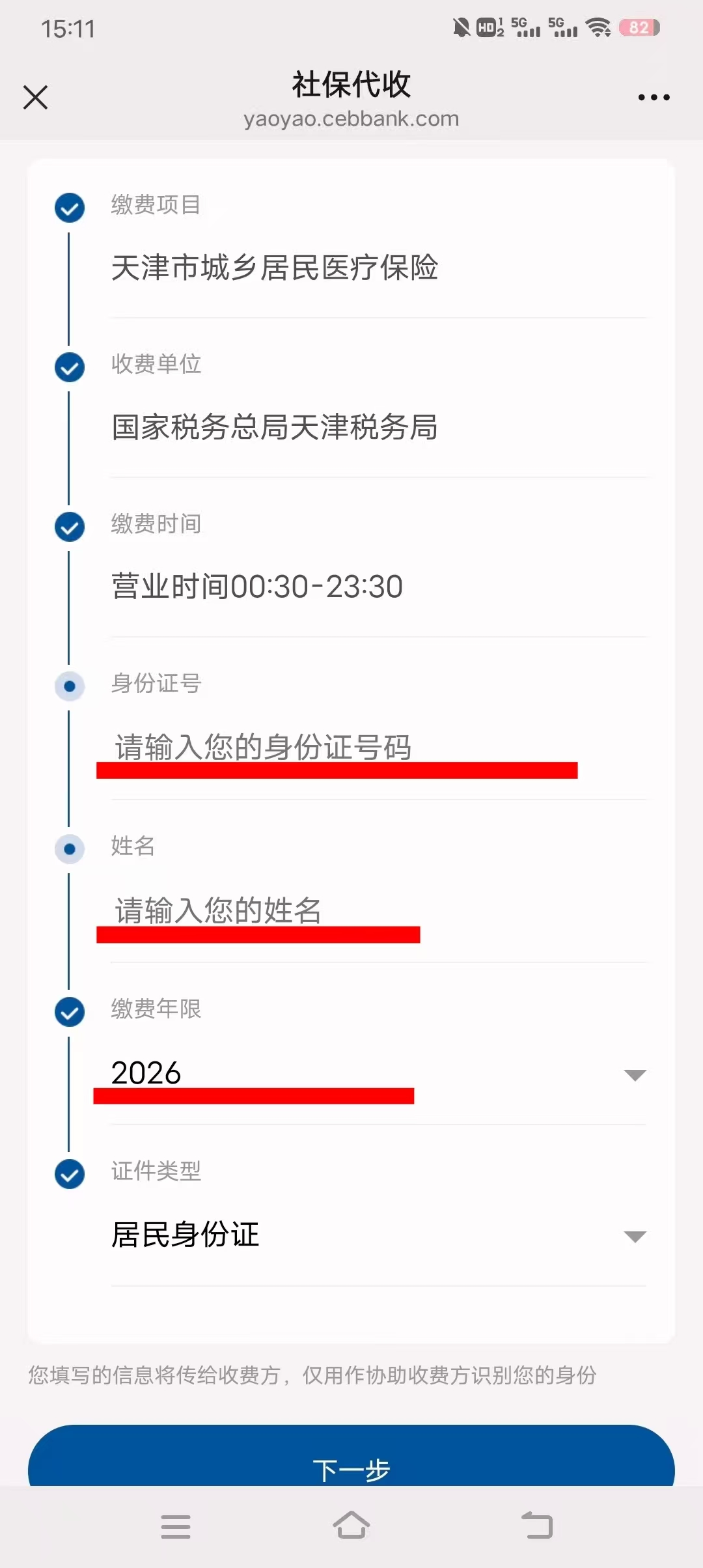 填写姓名与身份证号,确认缴费年限为“2026年”,点击“下一步”。