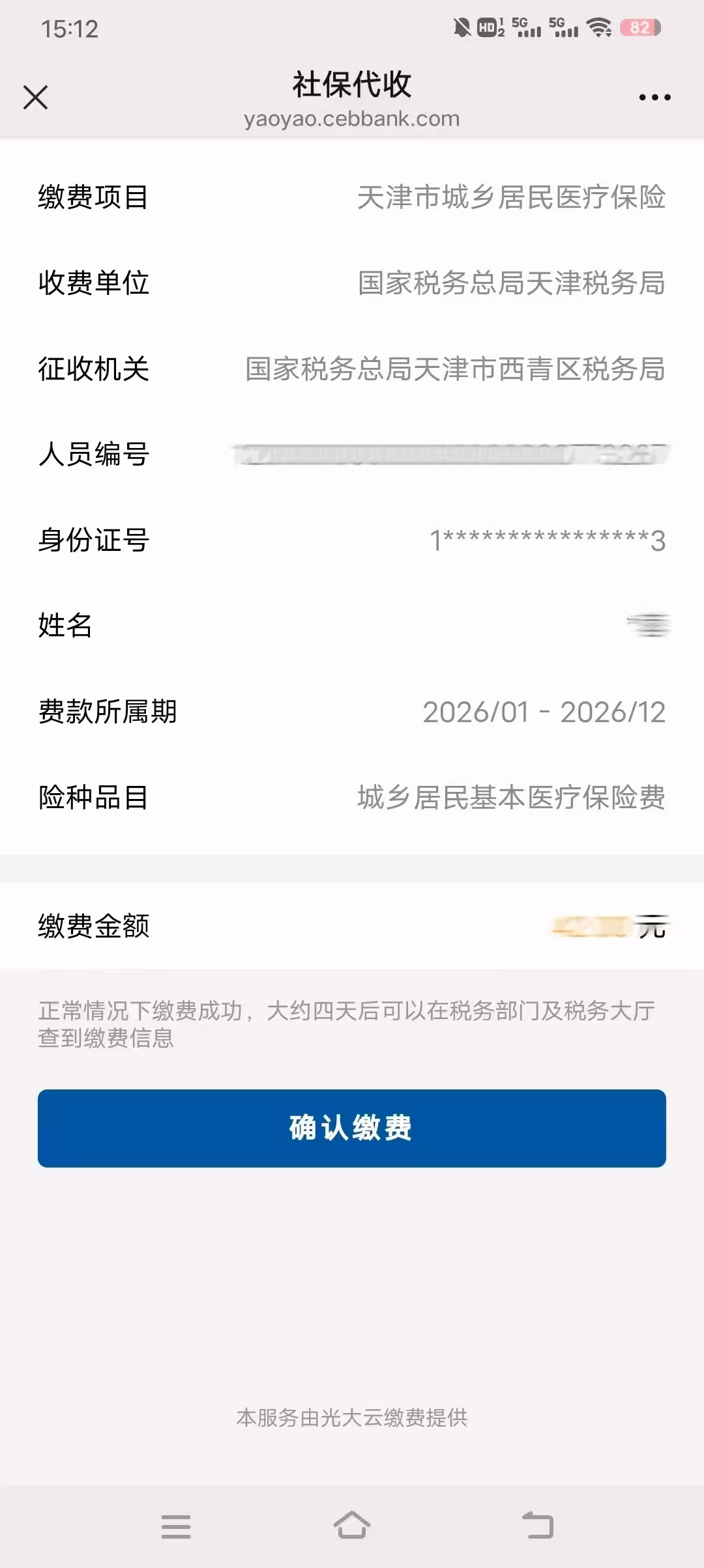 再次确认个人信息、费款所属期无误,点击“确认缴费”进行缴费。