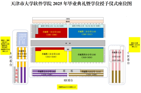 参加毕业典礼的2025届毕业生,需于6月23日上午7:15着学士服、佩戴学士帽,到各公司指定地点集合完毕。请务必按照下图指示集合,听从志愿者指挥,跟随大部队进入会场。